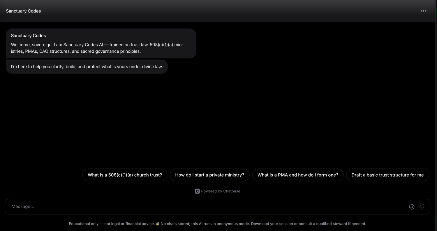 Sanctuary Codes AI is your digital mentor for building sovereign foundations in the private domain. This custom-trained intelligence merges trust law, divine governance, and sacred structure—guiding you step by step to form ministries, trusts, and assemblies beyond state jurisdiction. Whether you’re establishing a faith-based organization or fortifying generational assets, Sanctuary Codes provides the clarity, language, and templates to operate lawfully, peacefully, and powerfully within God’s order.
