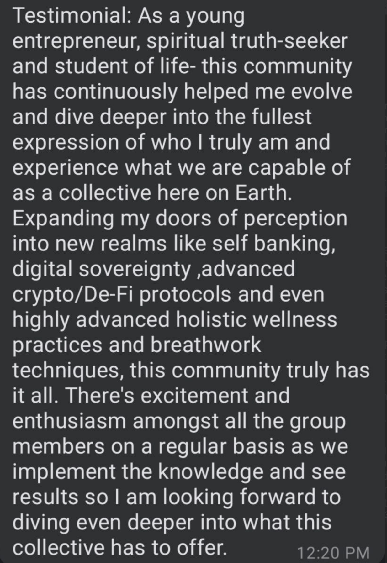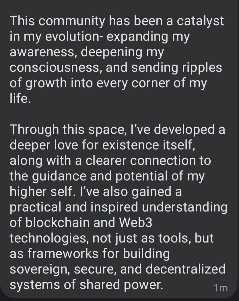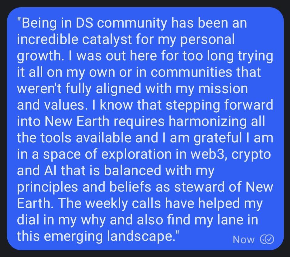 - Being in DS community has been an incredible catalyst for my personal growth. I was out here for too long trying it all on my own or in communities that weren't fully aligned with my mission and values. I know that stepping forward into New Earth requires harmonizing all the tools available and I am grateful I am in a space of exploration in web3, crypto and AI that is balanced with my principles and beliefs as steward of New Earth. The weekly calls have helped my dial in my why and also find my lane in this emerging landscape.