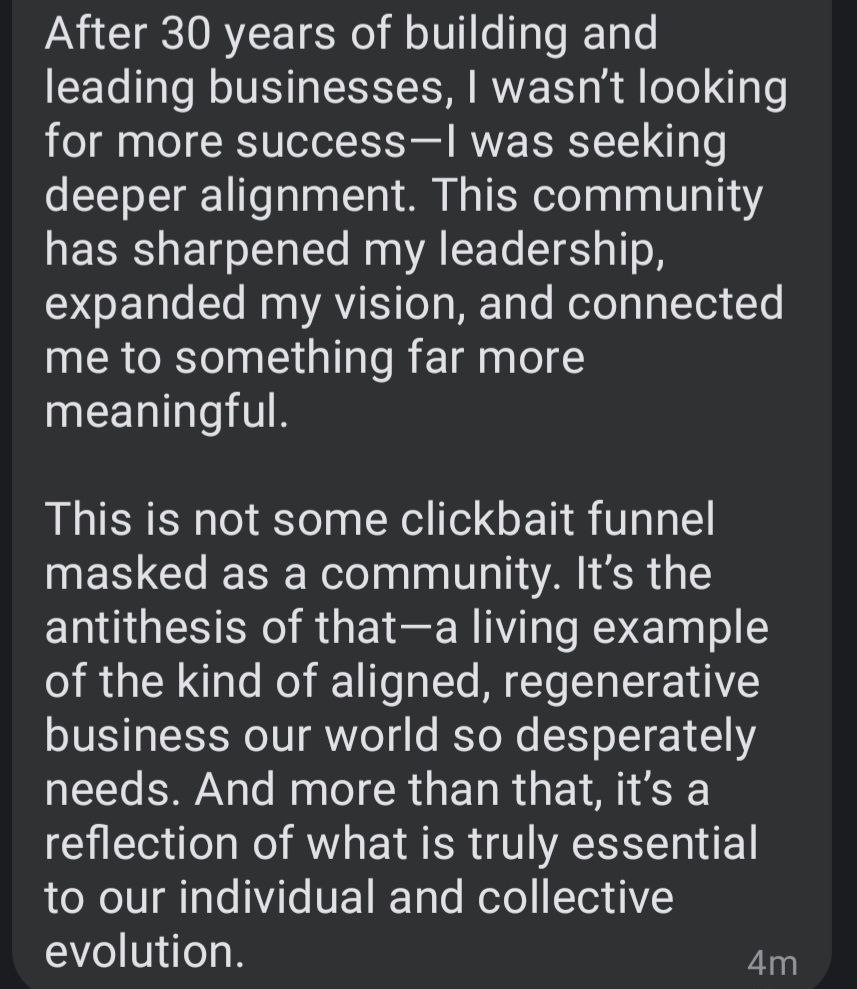 - Private Skool-based network of aligned visionaries and builders